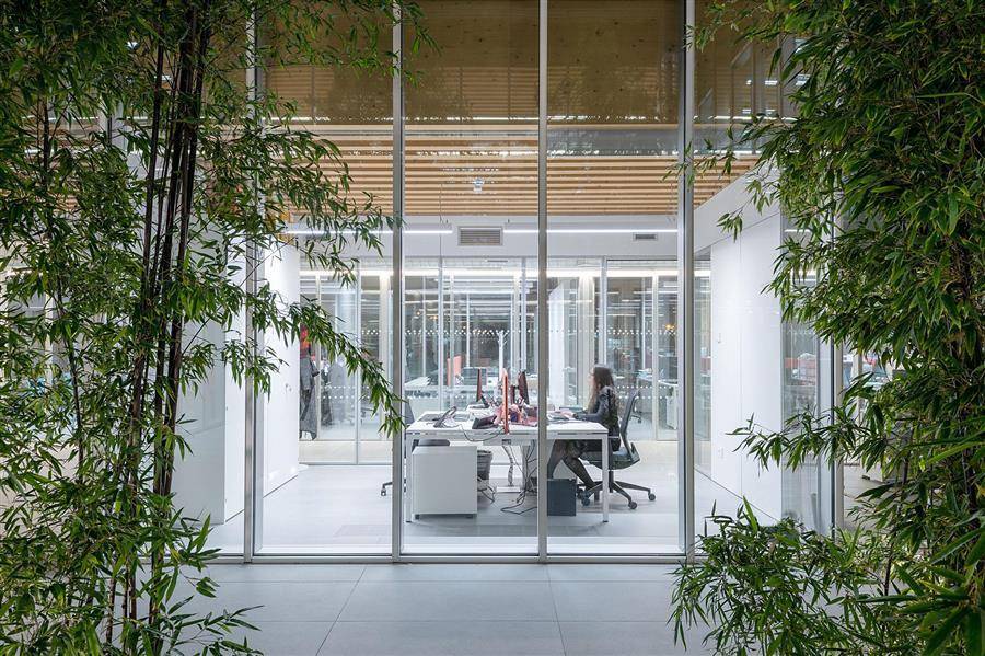 外立面为全玻璃幕墙,契合了Iperceramica开放、高效的企业文化,人们在室外就能欣赏到室内的工作环境,以欢迎的姿态迎接客户来体验建筑。