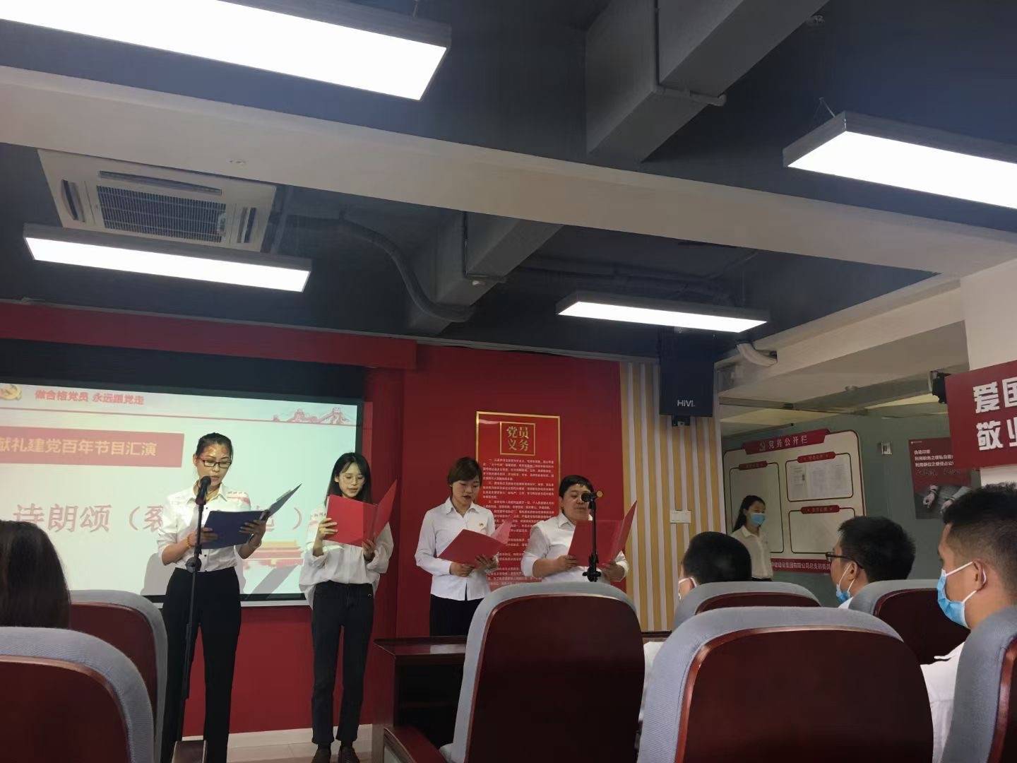 最后还有各部门准备的文艺汇演表演,振奋人心的歌曲合唱《团结就是力量》《我们走在大路上》,《爱我中华》等让我们从铿锵有力的歌声中感受到党的力量,还有用文字传达精神的朗诵表演,用坚毅的文字展现了我们国的精神与伟大。最后以一首《没有共产党就没有新中国》的全体大合唱结束了这次活动,大家有力的歌声体现了建党百年后中华民族的精神与力量,体现了我们民族不畏困难的决心,我们是打不倒的中国人,我们是不断前进的中国共产党人!